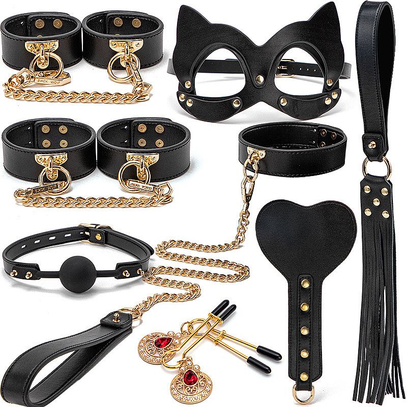 kit sado composto por mordaça, venda, coleira com estirante de corrente e guia, chicote, algema e tornozeleira e